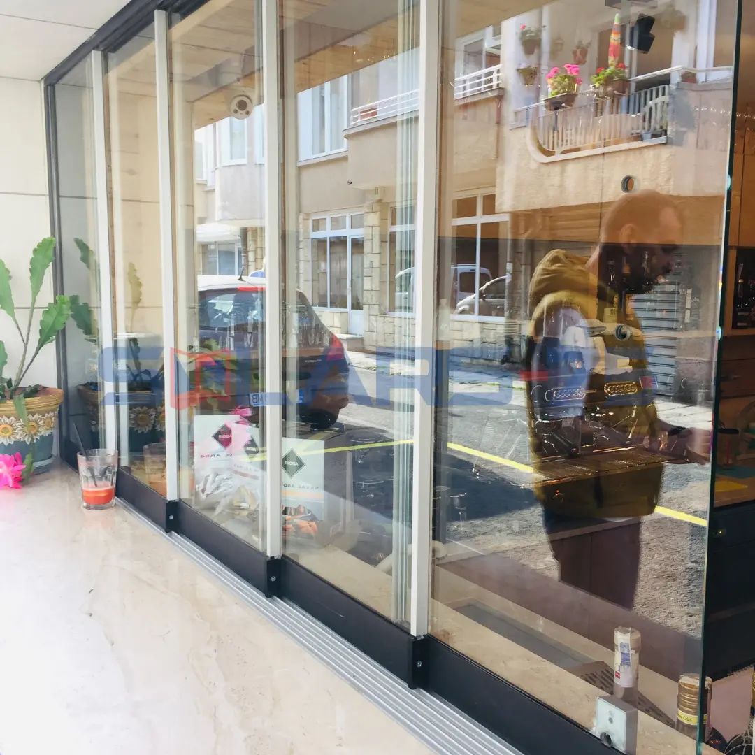 Цялостно остъкляване на ресторант с безпрофилно 5-канално плъзгащо остъкление с калено стъкло.