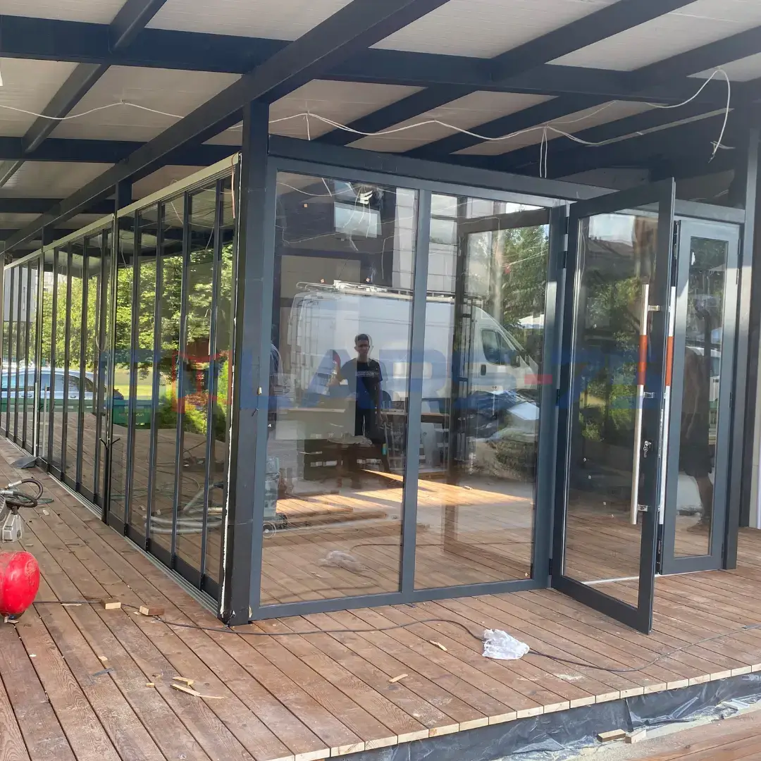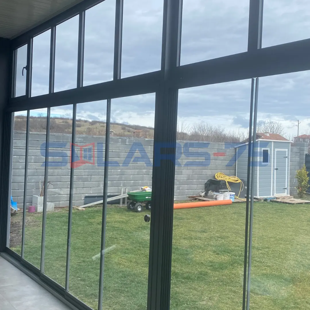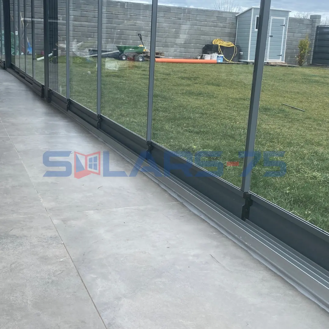 Цялостно затваряне на веранда с безпрофилно 5-канално плъзгащо остъкление с ниска релса и калено стъкло.