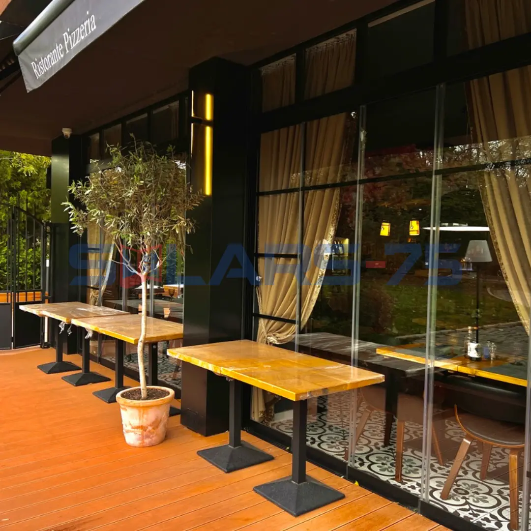 Обособяване на частична площ от заведние с безпрофилно 5-канално плъзгащо остъкление с калено стъкло, разделяйки елегантно самото помещение.