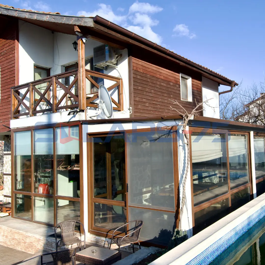 Веранда от Метална Конструкция облечена с фибран, покрив от термопанел с дебелина от 40 мм и PVC остъкляване с плъзгащ механизъм. Към Веранда са монтирани вътрешни щори.